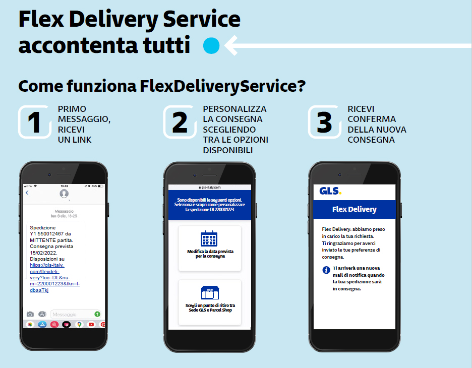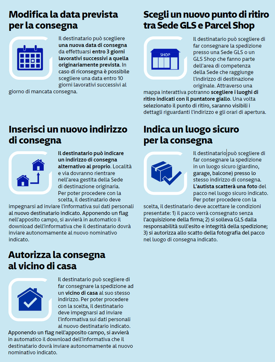Il servizio prevede di default la possibilità di selezionare una nuova data di consegna o la scelta del punto di ritiro; ma la flessibilità non finisce qui perché, se vorrai, potrai destinare altre opzioni di consegna ai tuoi clienti: un nuovo indirizzo per la spedizione, un luogo sicuro di consegna e autorizzare il ritiro da parte di un vicino di casa.