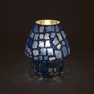 Partendo da una base in vetro trasparente gli artigiani applicano pezzi di vetro colorati componendo disegni unici e originali. La particolarità di queste lampade la si apprezza sia da spente, fungendo da vaso ornamentale, sia da accese da un lato per illuminazione e dall'altro come complemento d'arredo unico nel suo genere. Questa lampada indiana artigianale unisce pezzi irregolari di vetri color blu chiaro a piccoli inserti sferici a contorno del disegno. L'attacco per la lampadina (non inclusa nella confezione) è il classico passo grande (codice E27). Il porta lampada supporta dalle classiche lampadine standard fino alle più recenti a LED. Per ottenere l'effetto cromatico come nella foto è' consigliabile acquistare una lampadina con una resa minima paria a 60 Watt a luce fredda. La lampada da tavolo è fornita di cavo (lungo 1,8 mt.) con interuttore on/off tipo abajour (l'impianto elettrico è certificato CE - ENEC - KNEMA KNEUR by DEKRA). Questa lampada da tavolo in vetro è stata fabbricata nella regione del Rajhasthan nel nord ovest dell'India nel profondo rispetto del lavoro manuale.